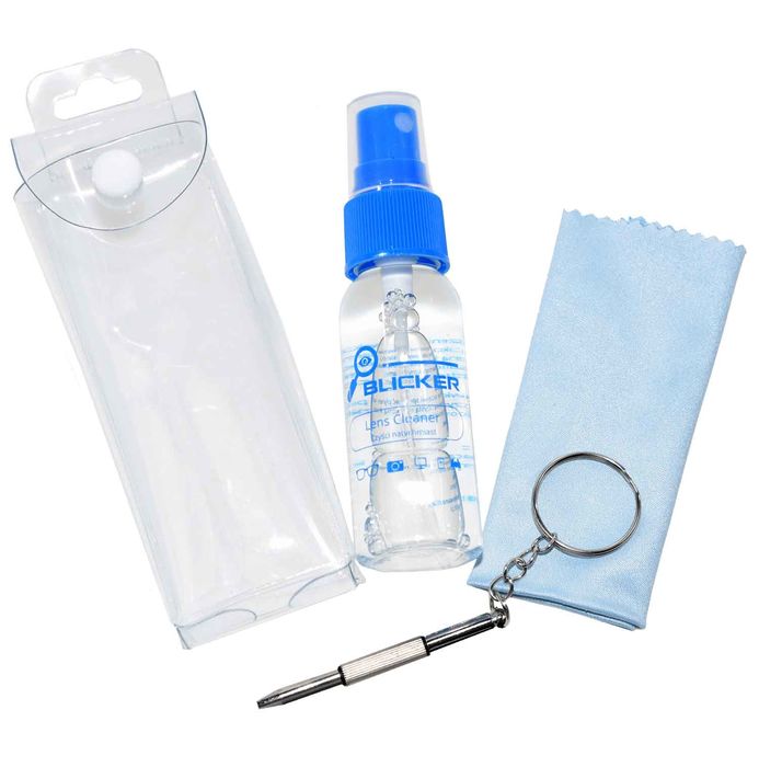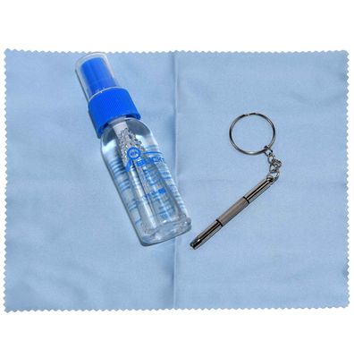 Táto sada je určená na údržbu primárne okuliarov. Sada obsahuje: handričku z kvalitného mikrovlákna 10x15 cm; obojstranný skrutkovač na okuliarové skrutky (x/-) a čistiaci sprej 30 ml.